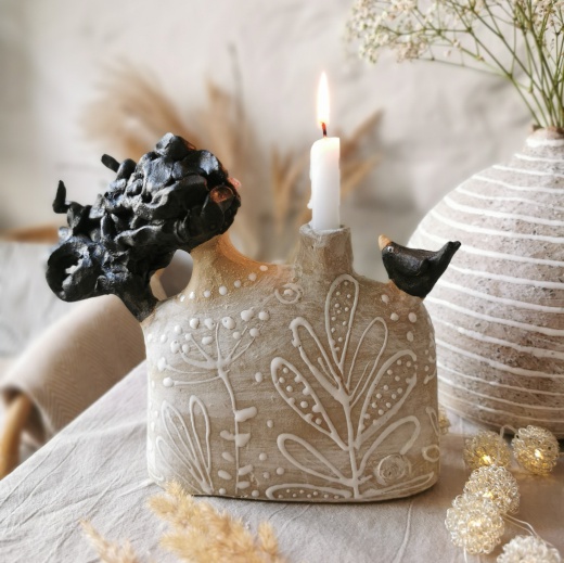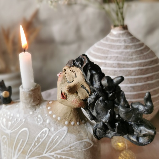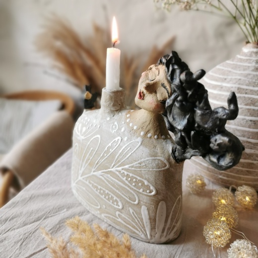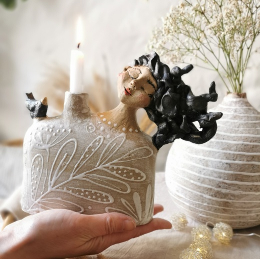 Diese Lichthalterin wurde mit viel Liebe modelliert, Nach dem 1. Brand habe ich sie mit einer weißen Glasur bemalt und gestaltet. Dann ein 2.tes mal bei 1250°C dicht gebrannt. Dadurch erhalten sie ihren einzigartigen Ausdruck und Charakter. Jeder Lichthalter ist immer ein kleines Unikat und absolutes Einzelstück.
