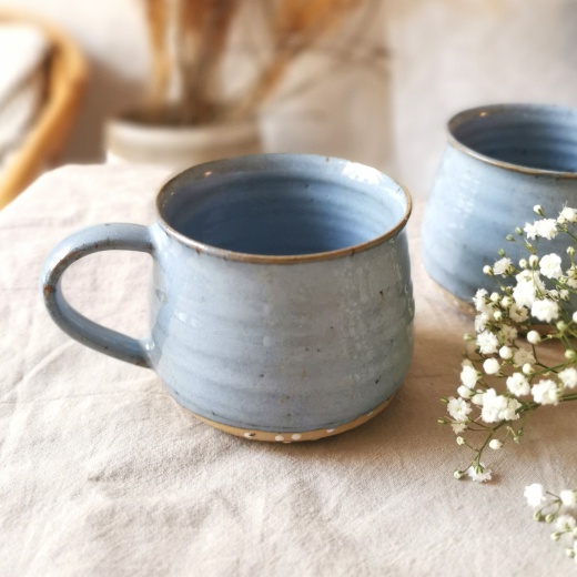 mit viel Liebe von Hand gedreht und einer blaugrauen Glasur die seidenmatt glänzt.