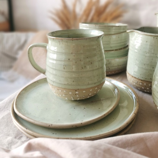 mit viel Liebe von Hand gedreht und einer pistaziengrünen Glasur die seidenmatt glänzt.