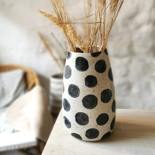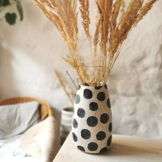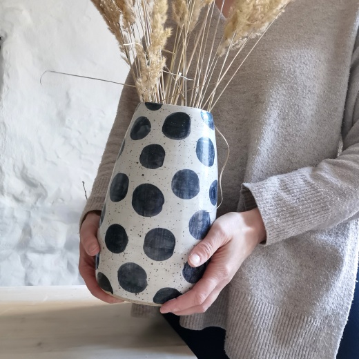 mit viel Liebe von Hand gedreht und einer weißen glänzenden Glasur und schwarzen Punkten. der Ton hat kleine braune Spots.