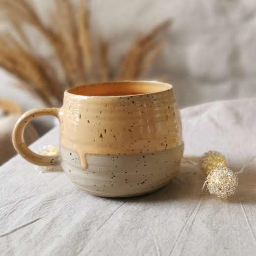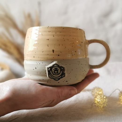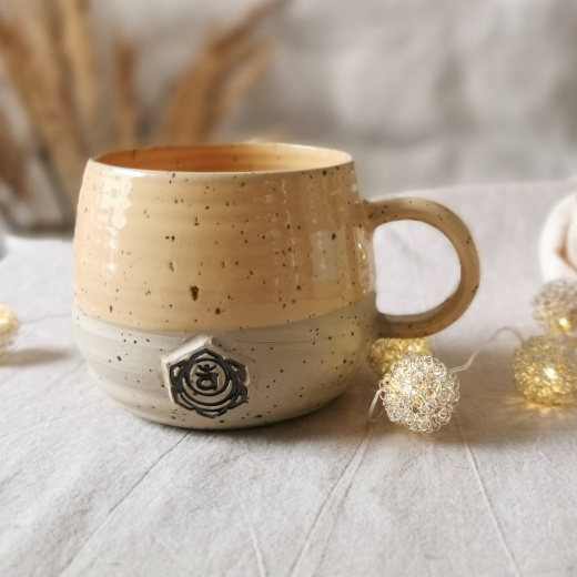 Meine Tasse wurde mit viel Liebe gedreht und hat ein modelliertes Emblem, die Hauptfarbe ist eine orangefarbende Glasur.