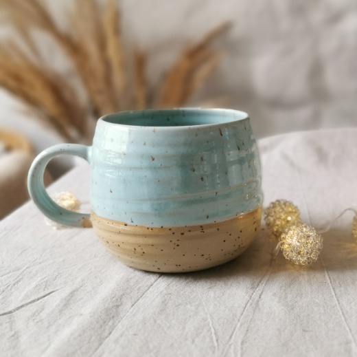 Meine Tasse wurde mit viel Liebe gedreht und hat ein modelliertes Emblem, die Hauptfarbe ist eine hellblaue Glasur.