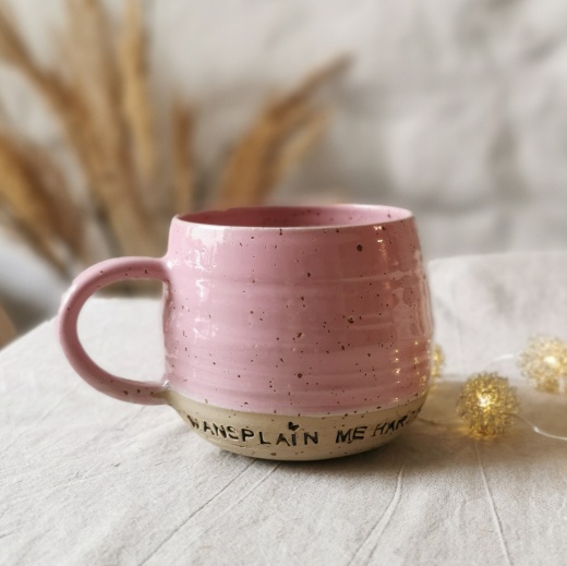 Diese Tasse wurde mit viel Liebe von Hand gedreht und einer rosafarbenden Glasur die leicht glänzend scheint, gebrannt.