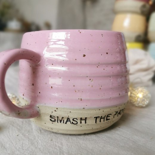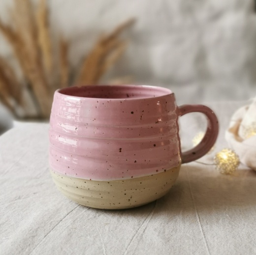 Diese Tasse wurde mit viel Liebe von Hand gedreht und einer rosafarbenden Glasur die leicht glänzend scheint, gebrannt.