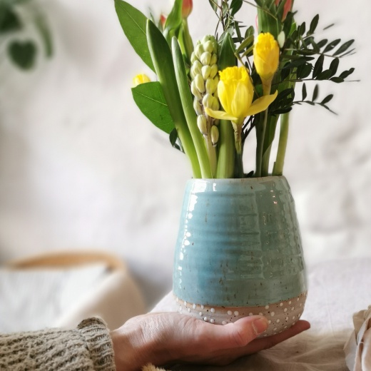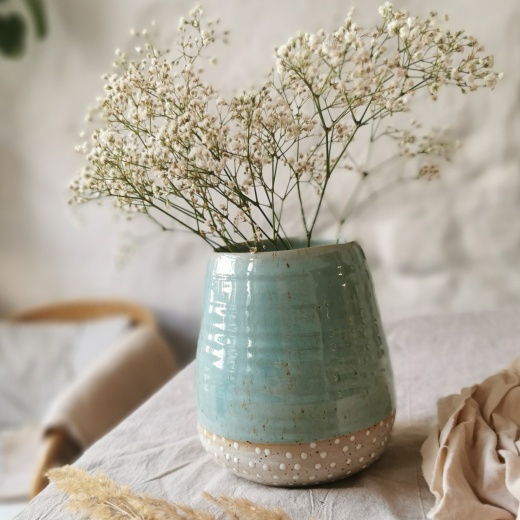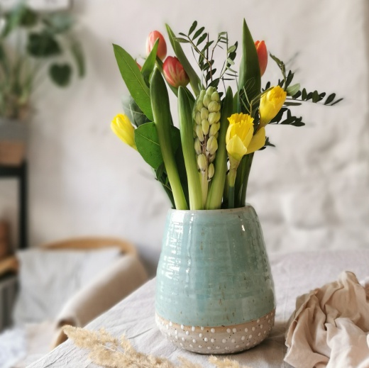 mit viel Liebe von Hand gedreht und einer türkisfarbenden Glasur die leicht glänzend scheinen.