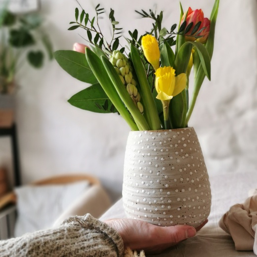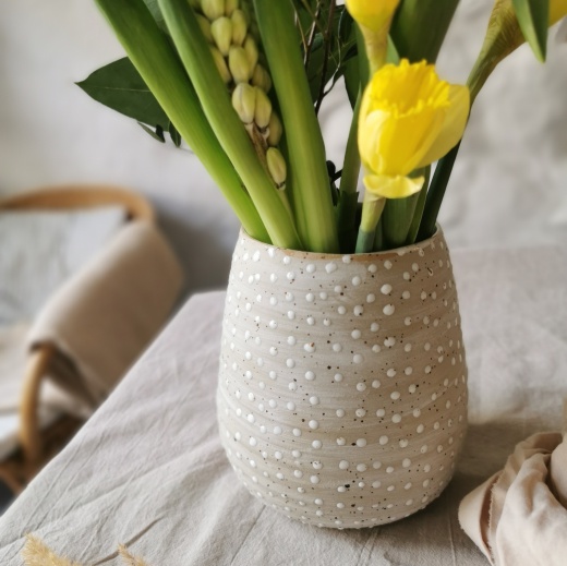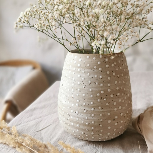 mit viel Liebe von Hand gedreht und kleinen creme weißen Glasurpunkten die leicht glänzend scheinen.